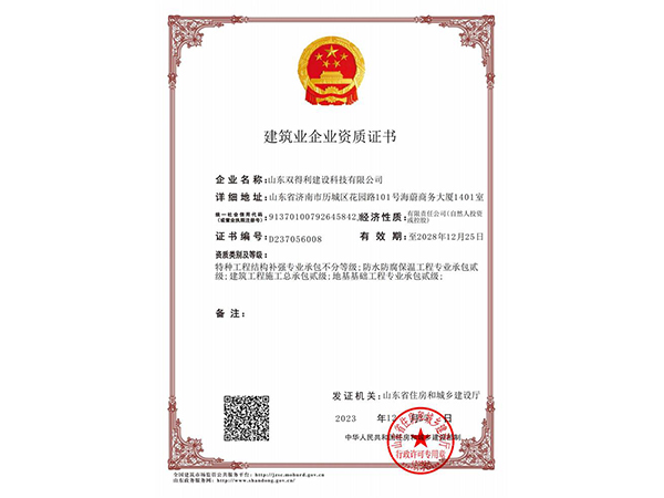 山東雙得利建設(shè)科技有限公司是一家集科研、工程技術(shù)開發(fā)、咨詢、工程結(jié)構(gòu)加固改造檢測(cè)、設(shè)計(jì)、施工于一體的綜合性、專業(yè)化企業(yè)。公司注冊(cè)資金5001萬(wàn)元,具備建筑工程施工總承包貳級(jí)、主體結(jié)構(gòu)工程檢測(cè)、特種工程結(jié)構(gòu)補(bǔ)強(qiáng)專業(yè)承包不分等級(jí)、地基基礎(chǔ)工程專業(yè)承包貳級(jí)、防水防腐保溫工程專業(yè)承包貳級(jí)、施工勞務(wù)不分等級(jí)資質(zhì)。現(xiàn)有高素質(zhì)人才126人,其中高級(jí)工程師6人,一級(jí)注冊(cè)結(jié)構(gòu)工程師2人,一級(jí)注冊(cè)建造師3人,一級(jí)注冊(cè)造價(jià)師2人,注冊(cè)監(jiān)理工程師2人,二級(jí)注冊(cè)結(jié)構(gòu)工程師4人,二級(jí)注冊(cè)建造師10人,中級(jí)工程師30余人,其他專業(yè)技術(shù)人員30余人。公司所有工程技術(shù)人員均從事工程施工行業(yè)多年。